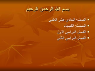 تتناول الوثيقة مادة إثرائية لمبحث الكيمياء للصف الحادي عشر، حيث تتضمن وحدات رئيسية تتعلق بمكونات الذرة، التفاعل الكيميائي، التاكسد والاختزال، المحاليل، الكيمياء الحرارية، والكيمياء العضوية. كما توفر معلومات مفصلة حول التجارب والنظريات الكيميائية المختلفة مثل نظرية دالتون وتجارب ميليكان ورذرفود. تهدف الوثيقة إلى تقديم المعرفة الأساسية والعملية المطلوبة للطلاب في مجال الكيمياء.