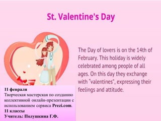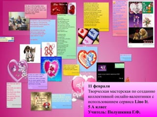 Документ описывает мероприятия, посвященные неделе английского языка, которые проходят 11-12 февраля. Включает творческие мастерские по созданию онлайн-валентинок и конкурсы валентинок для различных классов. Все мероприятия проводит учитель Полушкина Г.Ф.