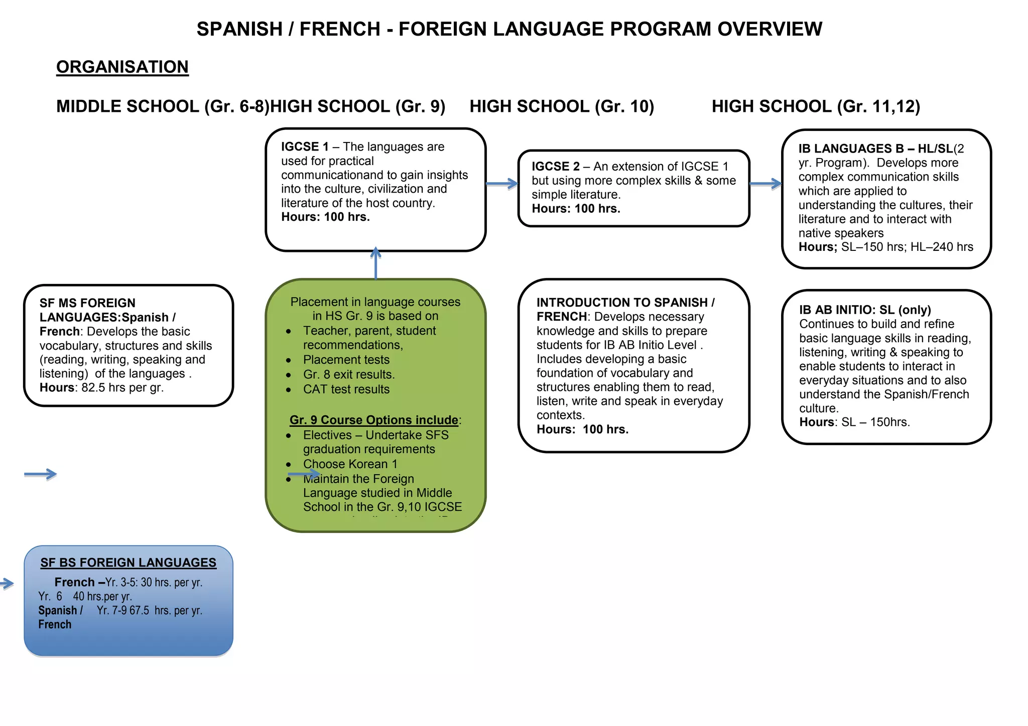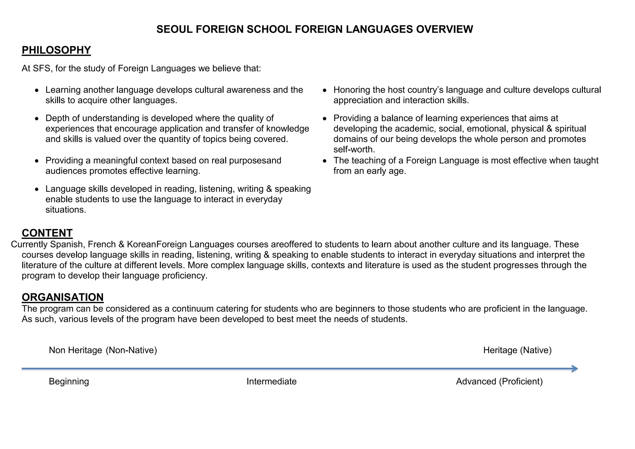 The document provides an overview of the foreign language programs offered at Seoul Foreign School. It offers Spanish, French, and Korean from elementary through high school. The programs are organized into levels from beginner to advanced to develop students' cultural awareness, language acquisition, and proficiency. In middle and high school, the courses prepare students for IGCSE and IB exams and aim to provide a balanced learning experience to develop students holistically.