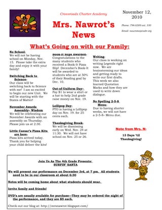 The document provides updates and announcements for students and families. It notes that there will be no school on November 15th and shares details about an upcoming science unit, November awards assembly, pizza kit delivery, and Book-It reading incentives. It also includes information about upcoming fundraisers, early dismissal before Thanksgiving break, and a 4th grade performance of "Surfin' Santa" in December.