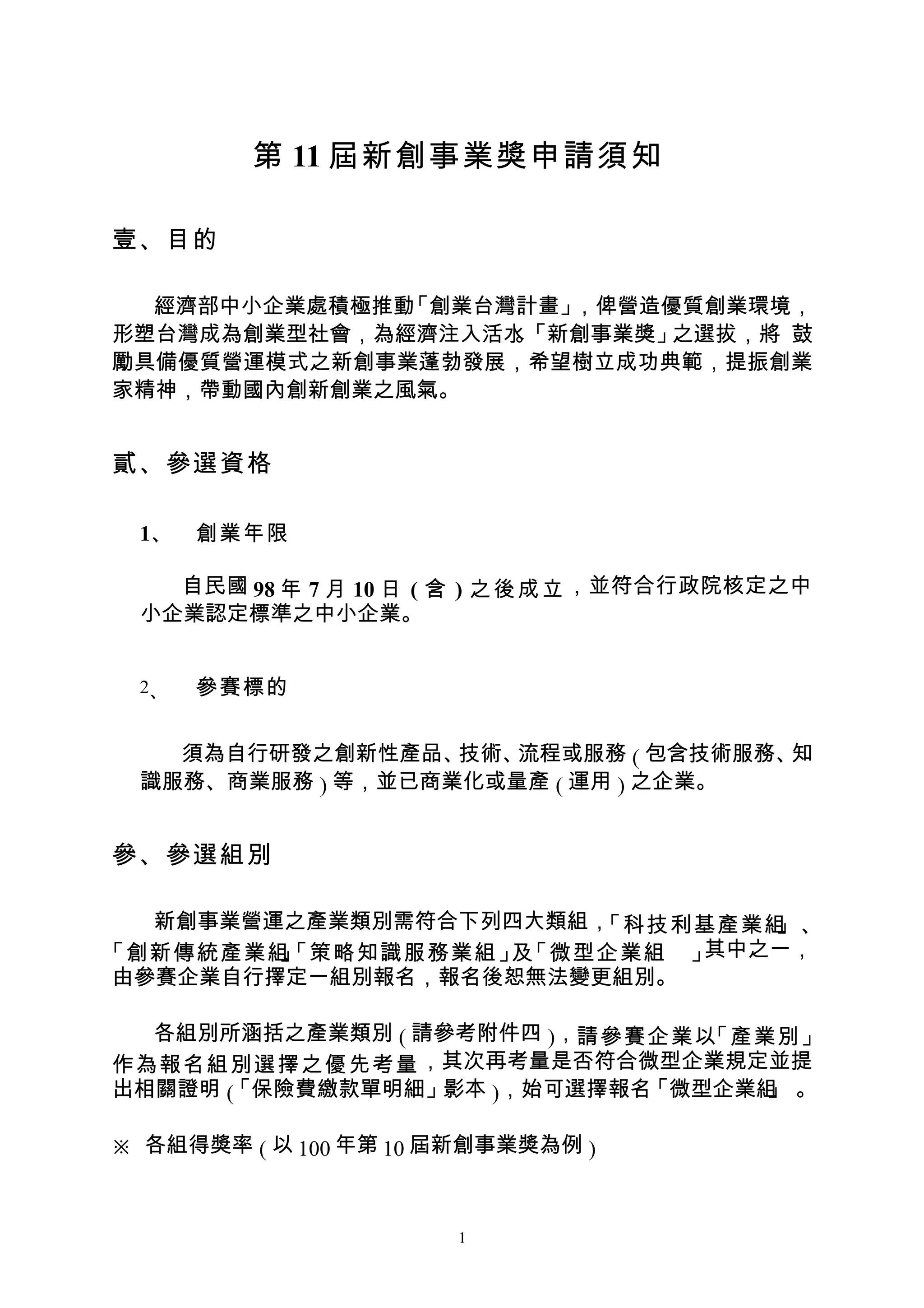 第11屆新創事業獎旨在鼓勵創新及具優質營運模式的中小企業發展,並將選出每組的前三名得獎者,獎金最高手金質獎為新台幣30萬元。參賽企業需自民國98年7月10日後成立並符合中小企業標準,並需提交詳細的營運計畫書及相關證明文件以參加選拔。獎項分為科技利基、創新傳統、策略知識服務及微型企業四大組別,各組別得獎率不盡相同。