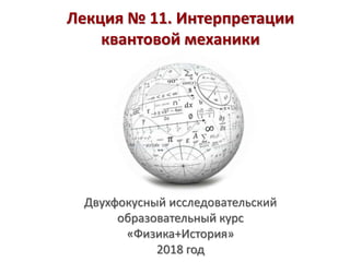 Документ представляет собой лекцию, посвященную интерпретациям квантовой механики, с акцентом на философские аспекты и различные подходы к пониманию её природы. Обсуждаются проблемы, такие как связь квантовой механики с физикой и метафизикой, а также множественные трактовки квантовых явлений, включая экспериментальные парадоксы и концепцию квантового наблюдателя. Лекция затрагивает в том числе и культурные аспекты физики через призму истории и философии.