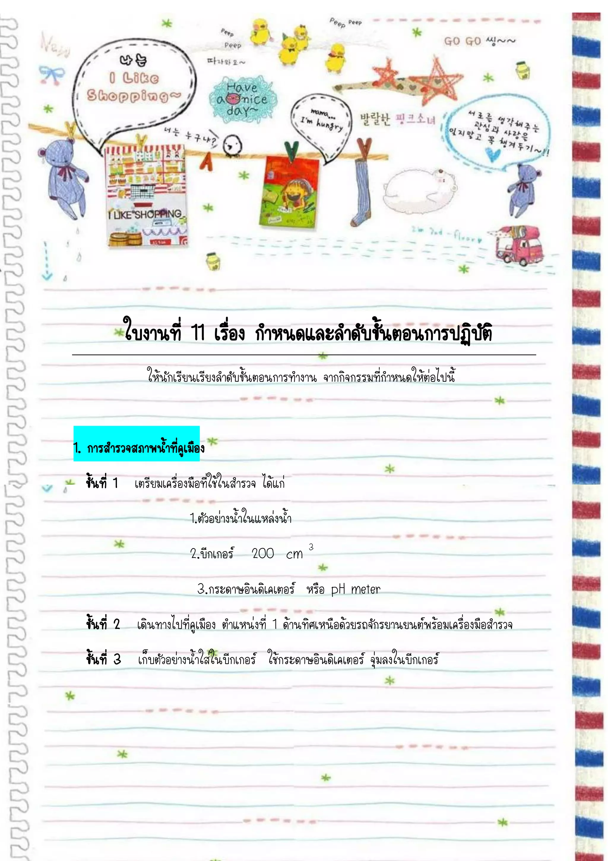 กาหนดและลาดับขั้นตอนการปฏิบัติ ให้นักเรียนเรียงลาดับขั้นตอนการทางาน จากกิจกรรมที่กาหนดให้ต่อไปนี้ 1. การสารวจสภาพน้าที่คูเมือง ขั้นที่ 1 เตรียมเครื่องมือที่ใช้ในสารวจ ได้แก่ 1.ตัวอย่างน้าในแหล่งน้า 3 2.บีกเกอร์ 200 cm 3.กระดาษอินดิเคเตอร์ หรือ pH meter ขั้นที่ 2 เดินทางไปที่คูเมือง ตาแหน่งที่ 1 ด้านทิศเหนือด้วยรถจักรยานยนต์พร้อมเครื่องมือสารวจ ขั้นที่ 3 เก็บตัวอย่างน้าใส่ในบีกเกอร์ ใช้กระดาษอินดิเคเตอร์ จุ่มลงในบีกเกอร์