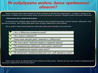 кілька етапів, що базуються на системному підході. Ці етапи розглянемо на прикладі. Побудуємо модель бази даних Бібліотека.