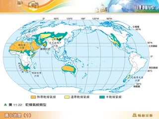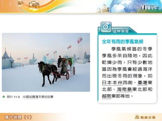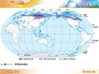 第11章讨论了全球气候分类,将气候分为热带、温带和寒带等多个类型,并详细描述了各类气候的特点和分布成因。文中还提及了影响气候的因素,如气温和降水等,以及季风对特定地区如印度半岛气候的作用。最后提供了气候类型的判断练习,以帮助理解不同地区的气候特征。