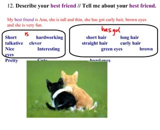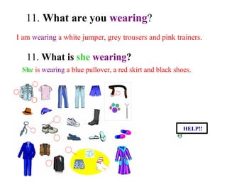The document describes various questions and answers about clothing, friends, locations, transportation, homes, days, pets and schools. It includes questions like "What are you wearing?", "Do you live near the school?" and "How do you come to school?". The responses provide details about clothes, whether the house is near the school, and ways of getting to school such as walking, driving, taking the bus or bike.