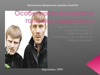 Документ представляет собой исследование феномена гопников как культурной группы подростков, изучая их агрессивное поведение и отношение к ним учащихся лицея. Основные задачи включают анализ литературы, анкетирование лицейистов и разработку стратегий поведения при встрече с гопниками. Работа подчеркивает значимость данной проблемы в лицейской среде и проводит классификацию гопников по внешним характеристикам и стилю жизни.