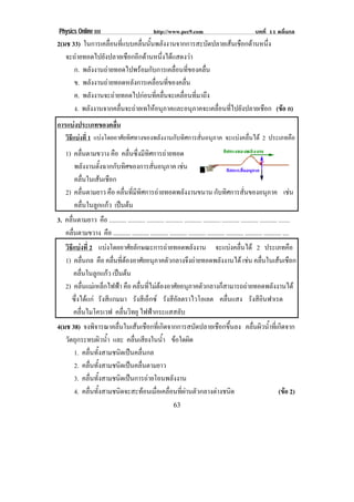 http://www.pec9.com บทที่ 11 คลื่นกล ! "$! 2(มช 33) ในการเคลื่อนที่แบบคลื่นนั้นพลังงานจากการสะบัดปลายเสนเชือกดานหนึ่ง จะถายทอดไปยังปลายเชือกอีกดานหนึ่งไดแสดงวา ก. พลังงานถายทอดไปพรอมกับการเคลื่อนที่ของคลื่น ข. พลังงานถายทอดหลังการเคลื่อนที่ของคลื่น ค. พลังงานจะถายทอดไปกอนที่คลื่นจะเคลื่อนที่มาถึง ง. พลังงานจากคลื่นจะถายเทใหอนุภาคและอนุภาคจะเคลื่อนที่ไปยังปลายเชือก (ขอ ก) การแบงประเภทของคลื่น วิธีแบงที่ 1 แบงโดยอาศัยทิศทางของพลังงานกับทิศการสั่นอนุภาค จะแบงคลื่นได 2 ประเภทคือ 1) คลื่นตามขวาง คือ คลื่นซึ่งมีทิศการถายทอด พลังงานตั้งฉากกับทิศของการสั่นอนุภาค เชน คลื่นในเสนเชือก 2) คลื่นตามยาว คือ คลื่นที่มีทิศการถายทอดพลังงานขนาน กับทิศการสั่นของอนุภาค เชน คลื่นในลูกแกว เปนตน 3. คลื่นตามยาว คือ ........... ........... ........... ........... ........... ........... ........... ........... ........... ....... คลื่นตามขวาง คือ ........... ........... ........... ........... ........... ........... ........... ........... ........... .... วิธีแบงที่ 2 แบงโดยอาศัยลักษณะการถายทอดพลังงาน จะแบงคลื่นได 2 ประเภทคือ 1) คลื่นกล คือ คลื่นที่ตองอาศัยอนุภาคตัวกลางจึงถายทอดพลังงานได เชน คลื่นในเสนเชือก คลื่นในลูกแกว เปนตน 2) คลื่นแมเหล็กไฟฟา คือ คลื่นที่ไมตองอาศัยอนุภาคตัวกลางก็สามารถถายทอดพลังงานได ซึ่งไดแก รังสีแกมมา รังสีเอ็กซ รังสีอัลตราไวโอเลต คลื่นแสง รังสีอินฟาเรด คลื่นไมโครเวฟ คลื่นวิทยุ ไฟฟากระแสสลับ 4(มช 38) จงพิจารณาคลื่นในเสนเชือกที่เกิดจากการสบัดปลายเชือกขึ้นลง คลื่นผิวน้ําที่เกิดจาก วัตถุกระทบผิวน้ํา และ คลื่นเสียงในน้ํา ขอใดผิด 1. คลื่นทั้งสามชนิดเปนคลื่นกล 2. คลื่นทั้งสามชนิดเปนคลื่นตามยาว 3. คลื่นทั้งสามชนิดเปนการถายโอนพลังงาน 4. คลื่นทั้งสามชนิดจะสะทอนเมื่อเคลื่อนที่ผานตัวกลางตางชนิด (ขอ 2) !