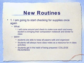 1. The document outlines new rules and routines being implemented in a classroom, including checking supplies, giving pop quizzes, and staggering exit slips.