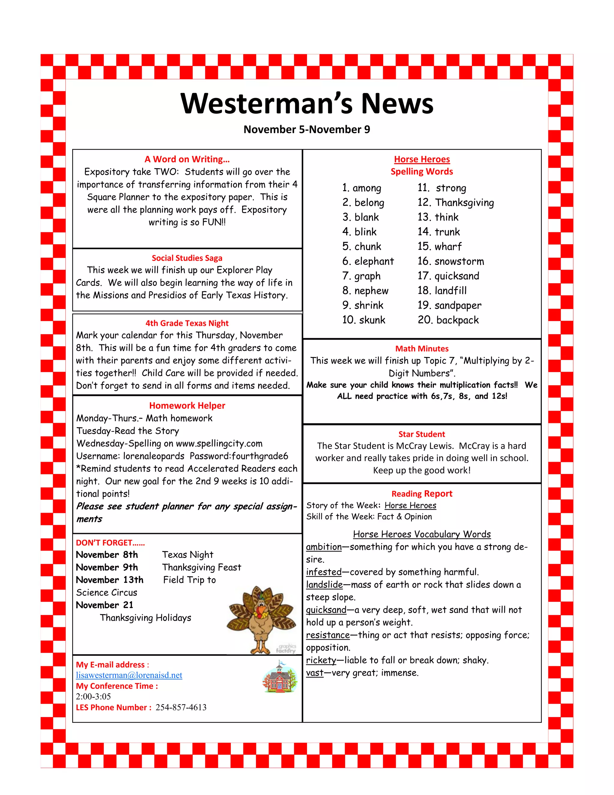 3) A 4th grade Texas night event will be held on Thursday November 8th for students and parents to enjoy activities together.