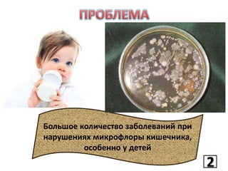 Документ обсуждает важность бифидобактерий для здоровья кишечника, особенно у детей, и проблемы с существующими препаратами, содержащими их. Представлены данные о производительности нового высокоэффективного эмульгированного препарата, который обещает быть более доступным и эффективным в сравнении с конкурентами. Также указаны потенциальные экономические выгоды и стратегии по увеличению производства и экспорта.