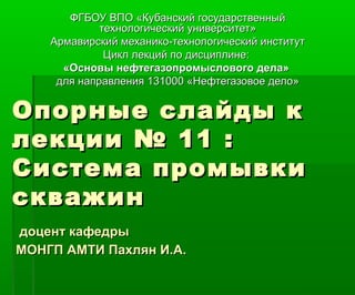 Документ представляет собой опорные слайды к лекции о системе промывки скважин в нефтегазовом деле, подготовленной доцентом кафедры монгп. В лекции рассматриваются основные понятия, назначение циркуляционной системы буровых установок, требования к буровым растворам, а также состав оборудования для промывки скважин. Основное внимание уделяется экономической выгоде замкнутой циркуляции бурового раствора и предотвращению загрязнения окружающей среды.