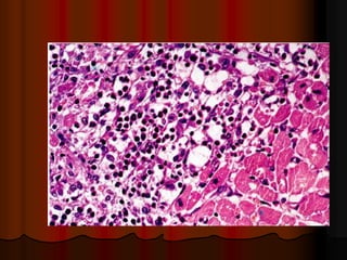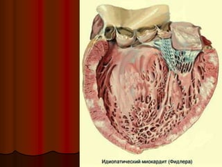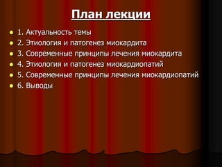 Лекция охватывает темы миокарда, включая миокардиты и миокардиопатии, их этиологию, патогенез и современные методы лечения. Данные исследования показывают, что миокардиты часто связаны с инфекциями, а диагностика включает клинические, лабораторные и инструментальные методы. Предлагаются рекомендации по лечению миокардитов, включая использование НПВП и антикоагулянтов, и представлены критерии диагностики.