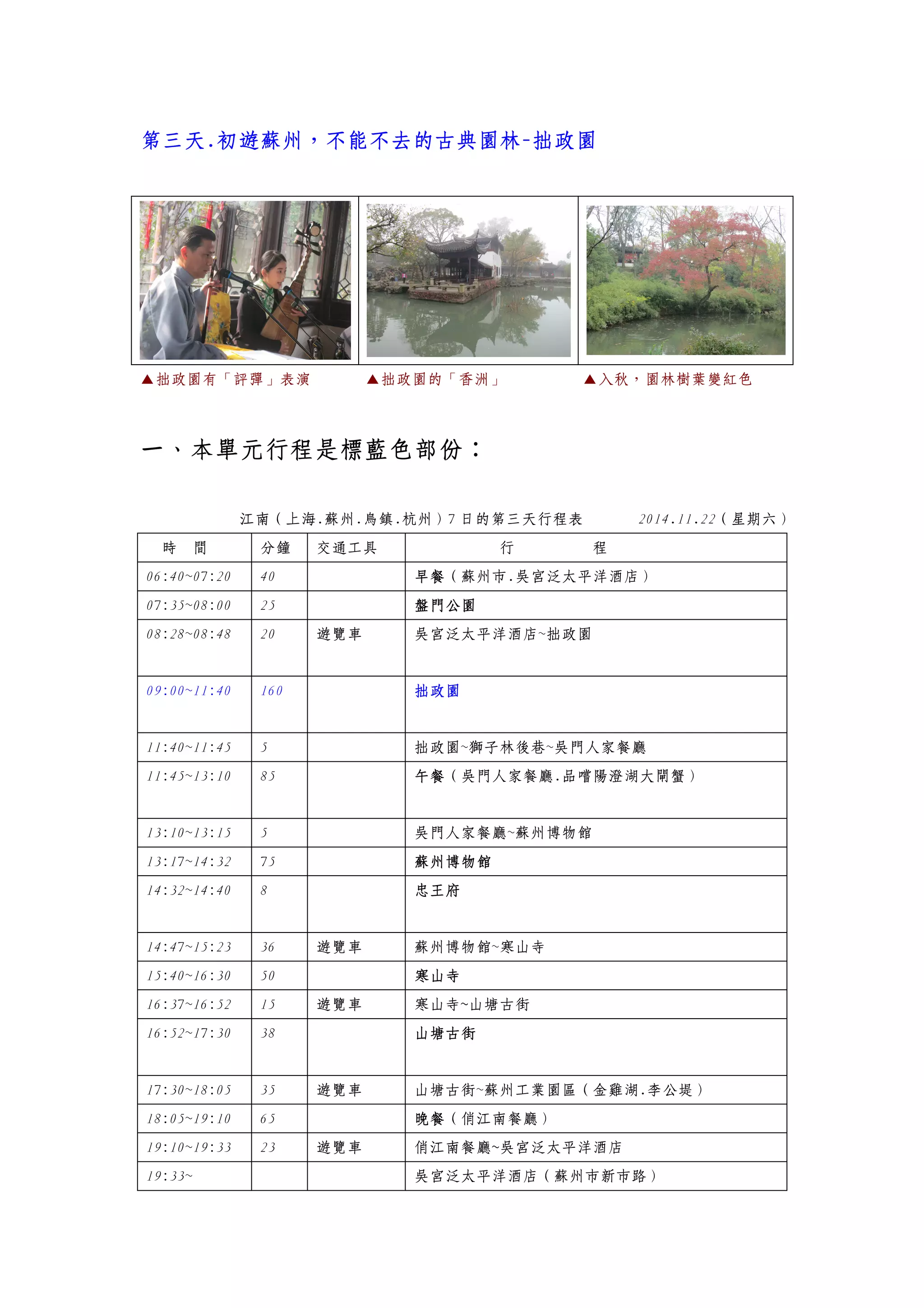 该文档描述了在苏州拙政园的游览行程,突出了这个古典园林的历史和美丽。拙政园是中国四大园林之一,具有丰富的文化背景,并被联合国教科文组织列为世界遗产。文章详细记录了参观时间、主要景点和导游讲解的内容,为游客提供了丰富的信息和旅游建议。