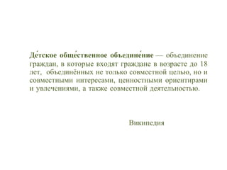 Документ описывает организацию детской экологической организации как инструмент для развития уверенности и самостоятельности у детей. Руководитель И.С. Гребенщкова описывает мероприятия, такие как акции и рейды, направленные на воспитание экологической ответственности среди детей. Также упоминаются результаты этих мероприятий и общее подведение итогов в конце года.