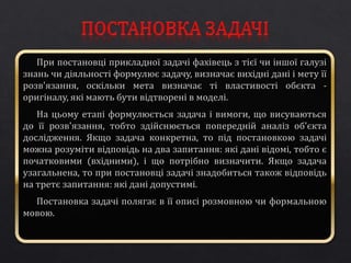 • Формалізація задачі, побудова інформаційної (зокрема математичної) моделі