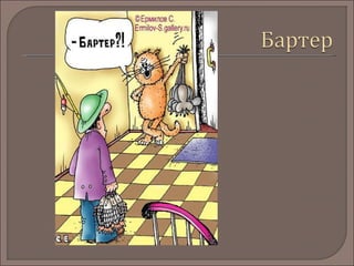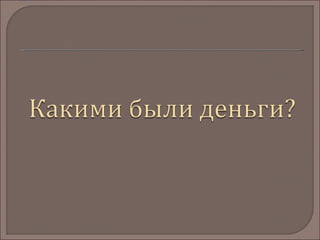 Документ описывает роль денег как всеобщего эквивалента и средства обмена, а также их функции, такие как мера стоимости, средство накопления и средство обращения. Он рассматривает историю денег, начиная с самых ранних форм, таких как раковины каури и каменные диски, и заканчивая современными формами, такими как кредитные и цифровые деньги. Также упоминается предсказание о создании единой валюты в будущем.
