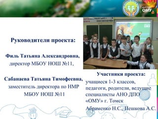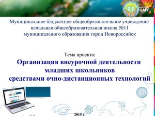 Документ описывает проект организации внеурочной деятельности младших школьников с использованием очно-дистанционных технологий, проведенный в Муниципальном бюджете Общеобразовательной школе №11 города Новороссийска. Главная цель проекта - создать информационно-образовательную среду для развития познавательного интереса учащихся и формирование поисковых навыков. Проект включает этапы реализации, задачи, программы и методы мониторинга, а также планы по развитию персонала и образовательной базы.