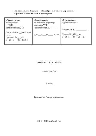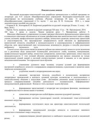 Документ представляет собой рабочую программу по литературе для 11 класса, составленную для муниципального образовательного учреждения. Основное внимание уделяется формированию литературной компетенции учащихся, включая анализ произведений, развитие коммуникативных умений и критического мышления. Программа также акцентирует внимание на необходимости интеграции знаний о литературе в социальный и культурный контексты, а также на использовании активных методов обучения.