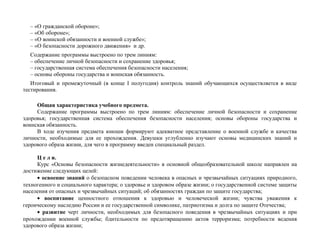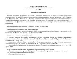 Рабочая программа по основам безопасности жизнедеятельности для 11 класса разработана на основе федерального стандарта и предназначена для обучения безопасному поведению в различных ситуациях, а также основам военной службы и гражданской обороны. Программа включает 35 часов занятий, в которых реализованы знания о здоровье, безопасности и обязанностях граждан. Контроль усвоения знаний осуществляется через тестирование, а содержание программы организовано по трем основным линиям: личная безопасность, государственная безопасность и основы обороны государства.