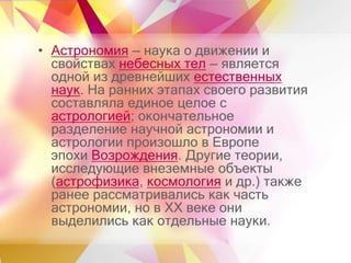Документ описывает историю астрономии как одной из древнейших наук, изначально связанной с астрологией, и её развитие через века, включая выделение новых дисциплин, таких как астрофизика и космология. Он также упоминает важные астрономические открытия и изобретения, такие как телескоп Галилея, который revolutionized астрономические наблюдения. В завершение, документ содержит интересные факты о небесных телах, в частности о Луне и Венере.