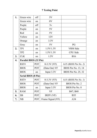 The document provides 7 points for testing a motherboard. Point 1 describes connecting different colored wires to voltage rails like 5V, 0V, and 3.3V. Point 2 involves checking voltages on the 1.5V/1.3V rails at the VRM and CPU sides. Point 3 checks the clock signal voltage on the 1.5V rail. Points 4-7 describe adjusting potentiometers to control reset signals, BIOS data, RAM signals, southbridge signals, and northbridge signals.