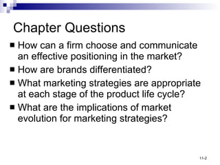 This document discusses positioning strategies for brands and products. It defines positioning as designing a company's offering and image to occupy a distinctive place in the target market's mind. Examples are given of positioning statements and how brands can differentiate themselves through points of difference and parity. The document also discusses how to convey a brand's category membership and ensure positioning claims are desirable, deliverable and address any negatively correlated attributes. It outlines strategies for product, personnel, channel and image differentiation and how marketing programs must be modified across a product's life cycle stages as the market evolves.