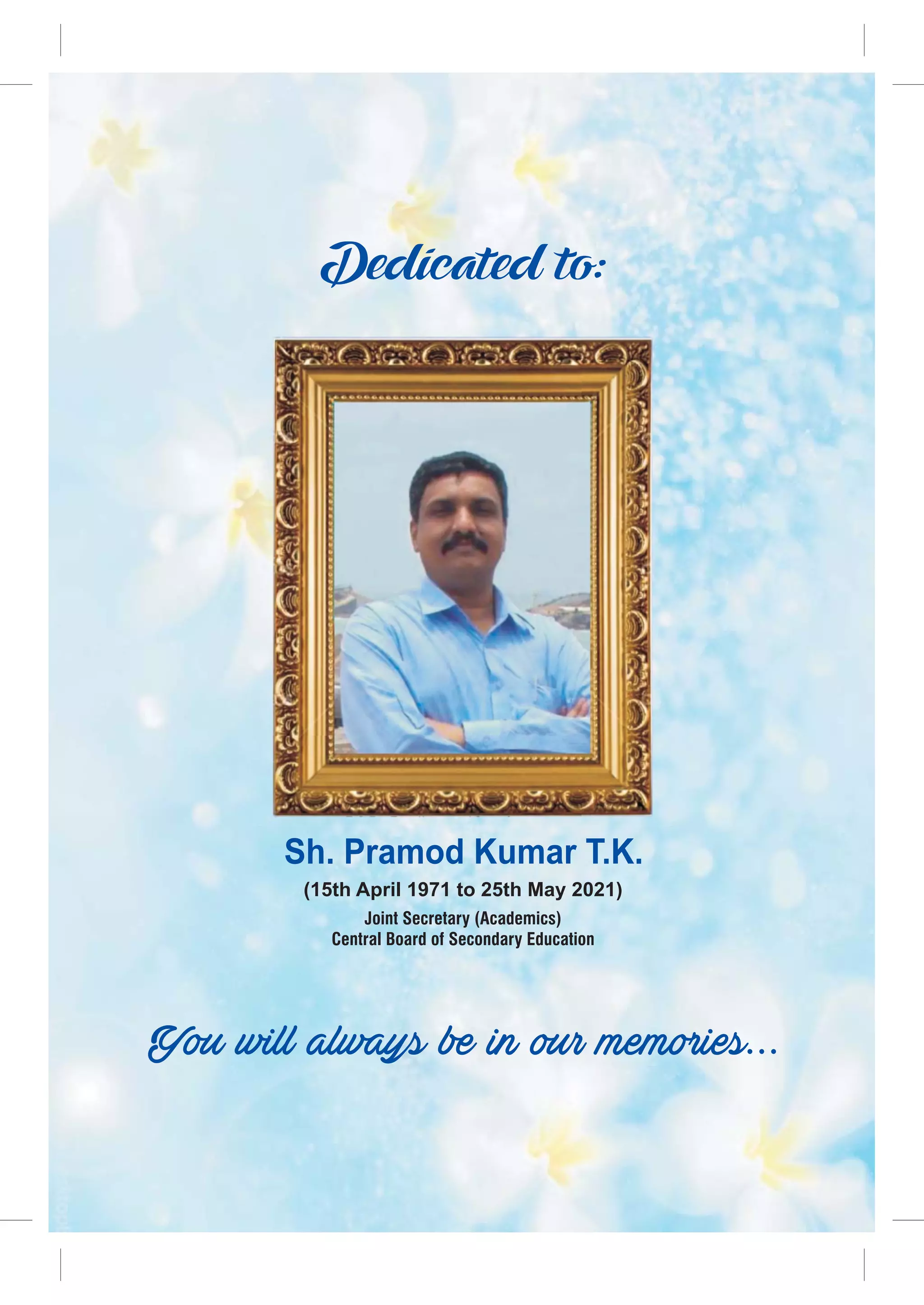 This document provides a summary of the life and career of Sh. Pramod Kumar T.K., who served as the Joint Secretary (Academics) at the Central Board of Secondary Education from April 15, 1971 to May 25, 2021. It dedicates his memory and recognizes his dedicated service in this role.
