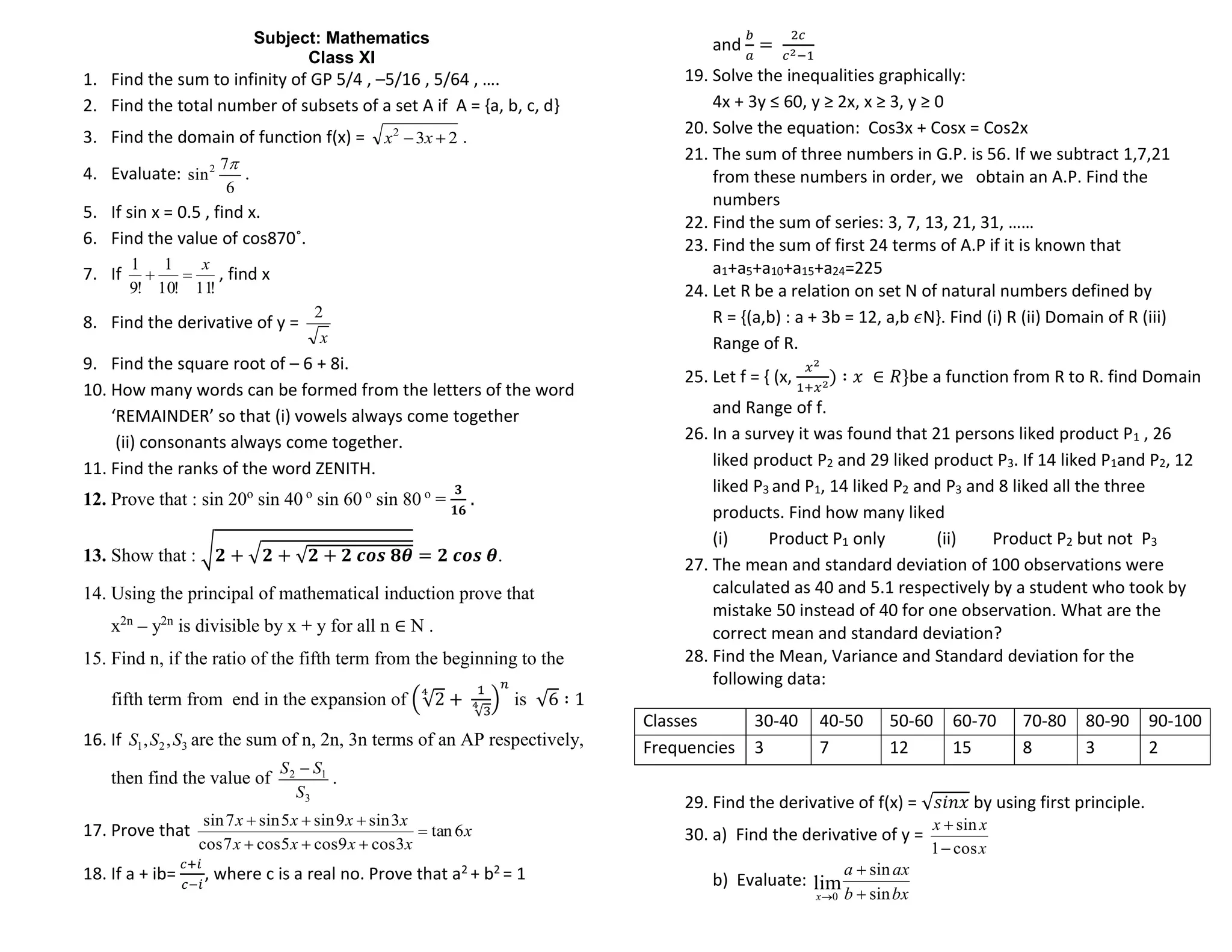 This document contains 30 mathematics problems spanning a variety of topics including calculus, trigonometry, sequences and series, probability, and statistics. The problems involve skills like finding sums, derivatives, domains, ranges, and solving equations.