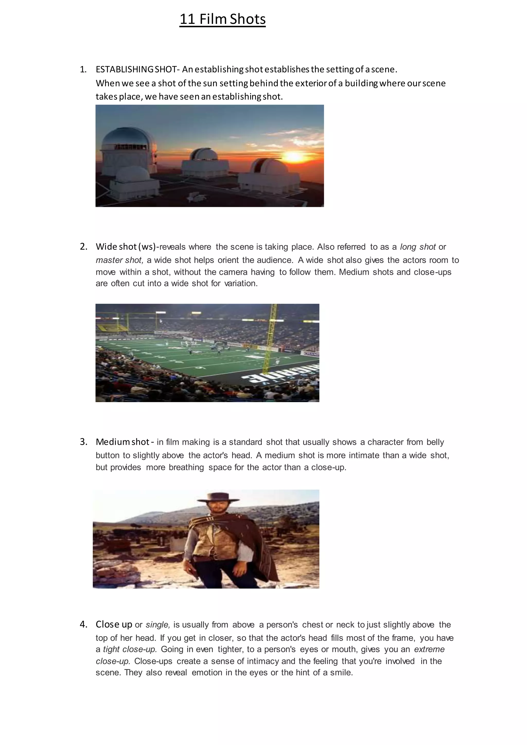 1. There are several types of film shots that establish different perspectives and levels of intimacy. These include establishing shots, wide shots, medium shots, close-ups, bird's-eye views, over the shoulder shots, low shots, two shots, and high angle shots.