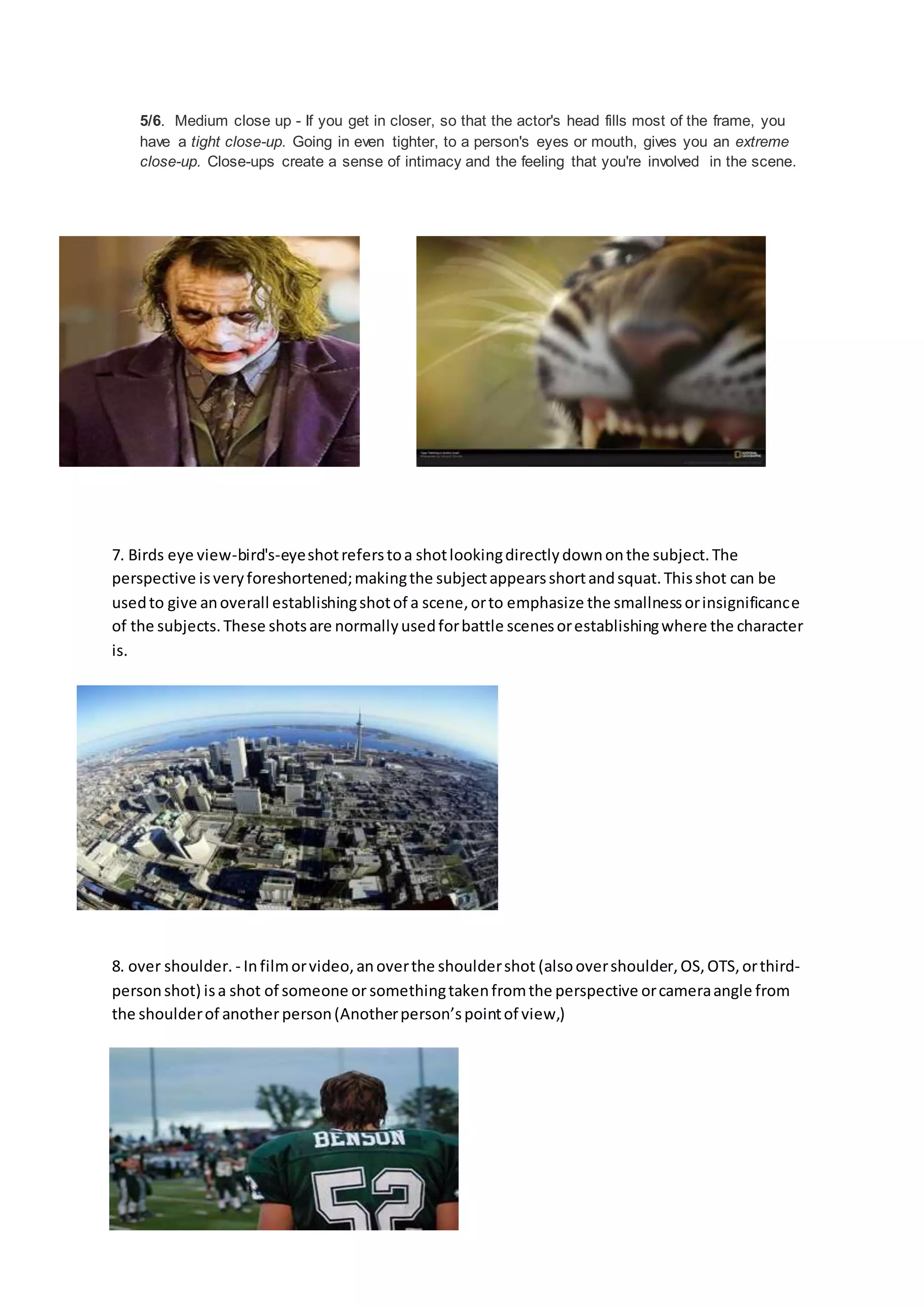 2. Establishing shots set the scene, wide shots provide context, medium shots show characters from belly button to head, and close-ups create intimacy. Bird's-eye views look directly down while low shots look up to make subjects appear powerful.