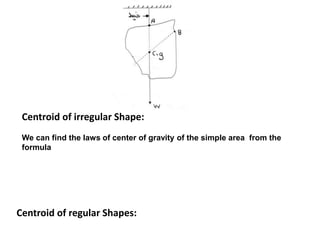 The document discusses centroids and centers of gravity. A centroid is defined as the point at which an area is considered to be concentrated. Formulas can be used to find the center of gravity for simple and regular shapes. The document provides information on calculating centroids for irregular and regular shapes.