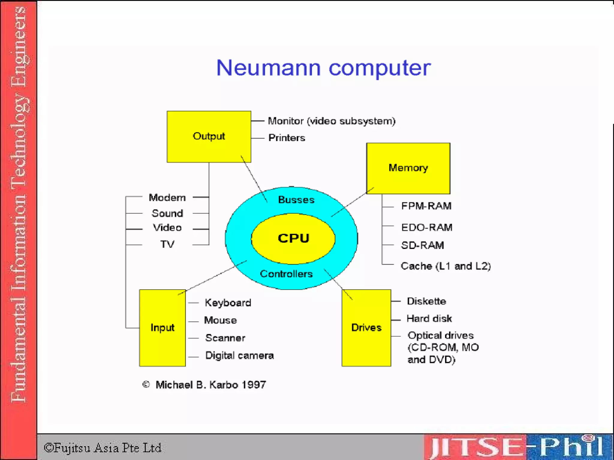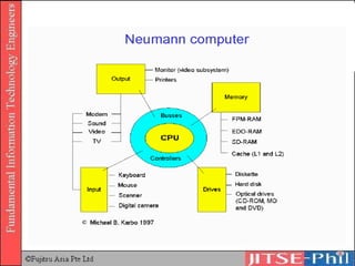 The document summarizes the five main units of a computer system: input, output, storage, arithmetic, and control units. It describes the functions of hardware components like integrated circuits, memory (RAM and ROM), and the processor. The processor has a control unit that retrieves and decodes instructions from memory and an arithmetic logic unit that performs calculations. Instructions are fetched, decoded, executed, and retired in sequence using the von Neumann architecture.