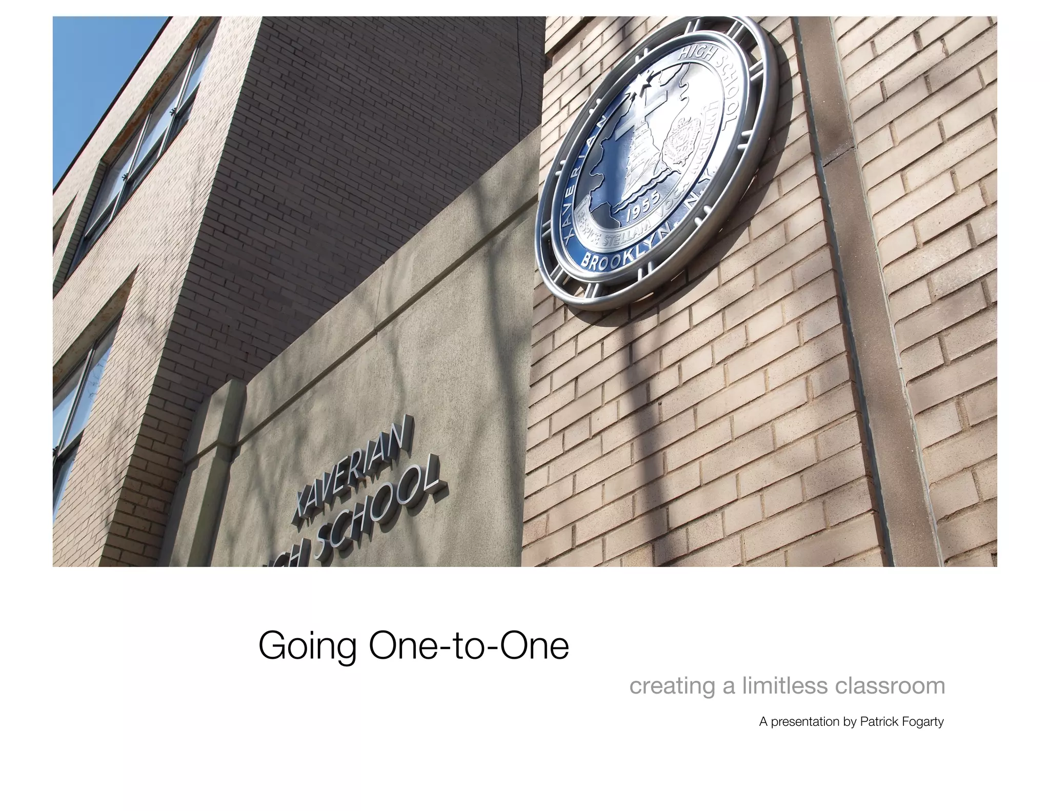 This document summarizes Patrick Fogarty's presentation on going one-to-one with mobile devices in classrooms. Fogarty discusses how the one-to-one movement started in schools in Greenock, Scotland and spread to his school in Brooklyn. He reviews research showing benefits of one-to-one programs such as increased in-depth research, positive impact on learning, and test score gains. Fogarty's school embraced blended learning with Edmodo as the centerpiece, untethering the classroom from its physical space. Edmodo provided a safe social space for students and helped teachers shift to facilitators of knowledge.