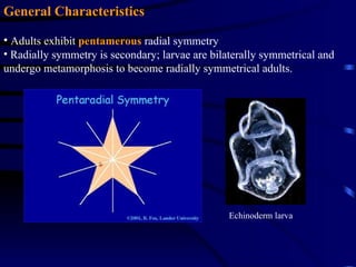 Echinoderms are radially symmetrical marine animals with a water vascular system and calcareous endoskeleton. They include sea stars, sea urchins, sea cucumbers, sand dollars, and sea lilies. Echinoderms exhibit pentamerous radial symmetry as adults but are bilaterally symmetrical as larvae. They possess tube feet that extend from the water vascular system and are important for locomotion, feeding, and gas exchange. The phylum contains five classes that vary in body form but share these key characteristics.