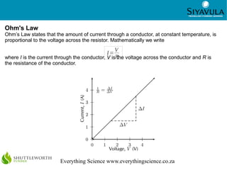 The document discusses key concepts in electric circuits including Ohm's Law, which states that current is directly proportional to voltage and inversely proportional to resistance. It explains that conductors that obey Ohm's Law are called ohmic conductors. It also covers series and parallel circuits, explaining that current is the same in all components of a series circuit while voltage splits, and that voltage is the same across parallel circuits while current splits. Finally, it defines electrical power as the rate energy is converted in a circuit and provides formulas for calculating power using voltage, current, and resistance.