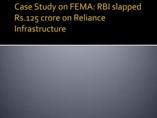 Reliance Infrastructure was asked to pay Rs. 125 crore in compounding fees by RBI for violating FEMA guidelines. It had parked $300 million from a foreign loan in mutual funds in India for 315 days before repatriating the funds overseas.