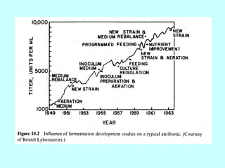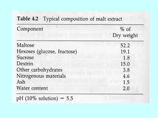 This document discusses various aspects of fermentation media formulation. It begins by noting that most fermentations require liquid media, often called broth. It then discusses factors to consider in media design like nutritional requirements, environmental requirements, and techno-economic factors. Some key points covered include the importance of optimizing media for high-producing microbial strains, different objectives in seed culture vs production media, and major carbon and nitrogen sources used like molasses, yeast extract, and corn steep liquor. The document provides details on constituents of media and considerations in media development.