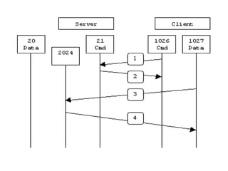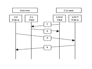 FTP uses ports 20 and 21 to transfer files between a client and server over TCP/IP networks like the internet. There are two transfer modes - active mode where the server connects to the client's data port, and passive mode where the client initiates both connections to the server's ports. HTTP is a request/response protocol used to transfer web pages over the internet, with clients like browsers making requests on port 80 to web servers, which respond with files, data, or error messages. Web servers translate URL paths to local file system paths and serve index files like index.html when directories are requested. HTTPS adds encryption and authentication to standard HTTP using port 443.