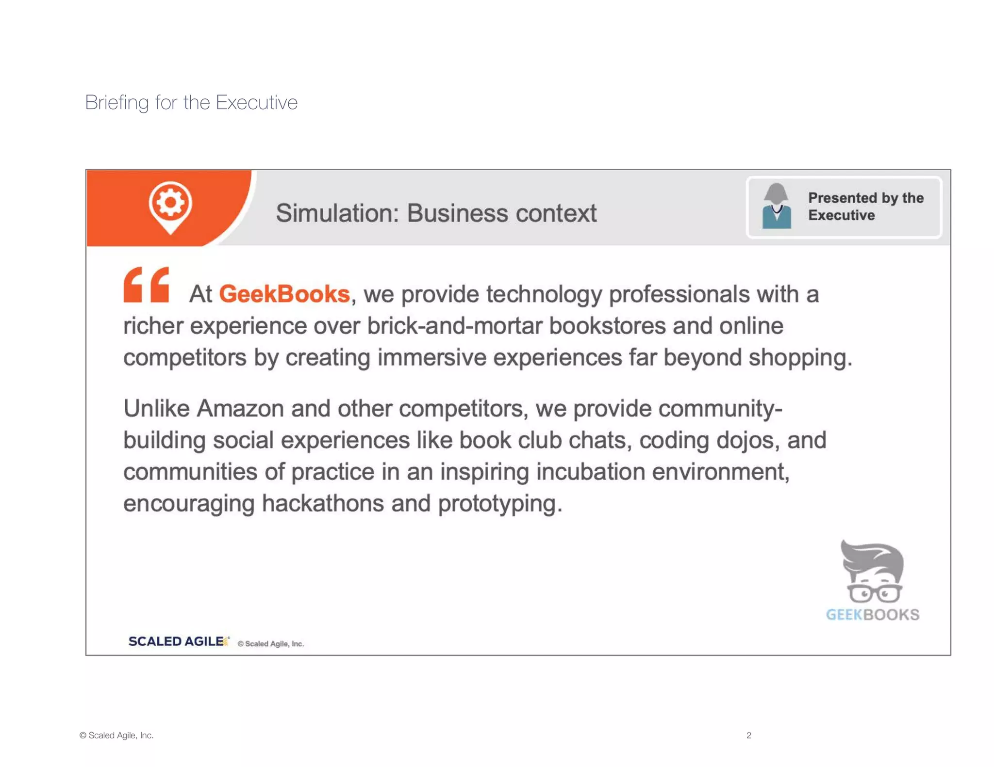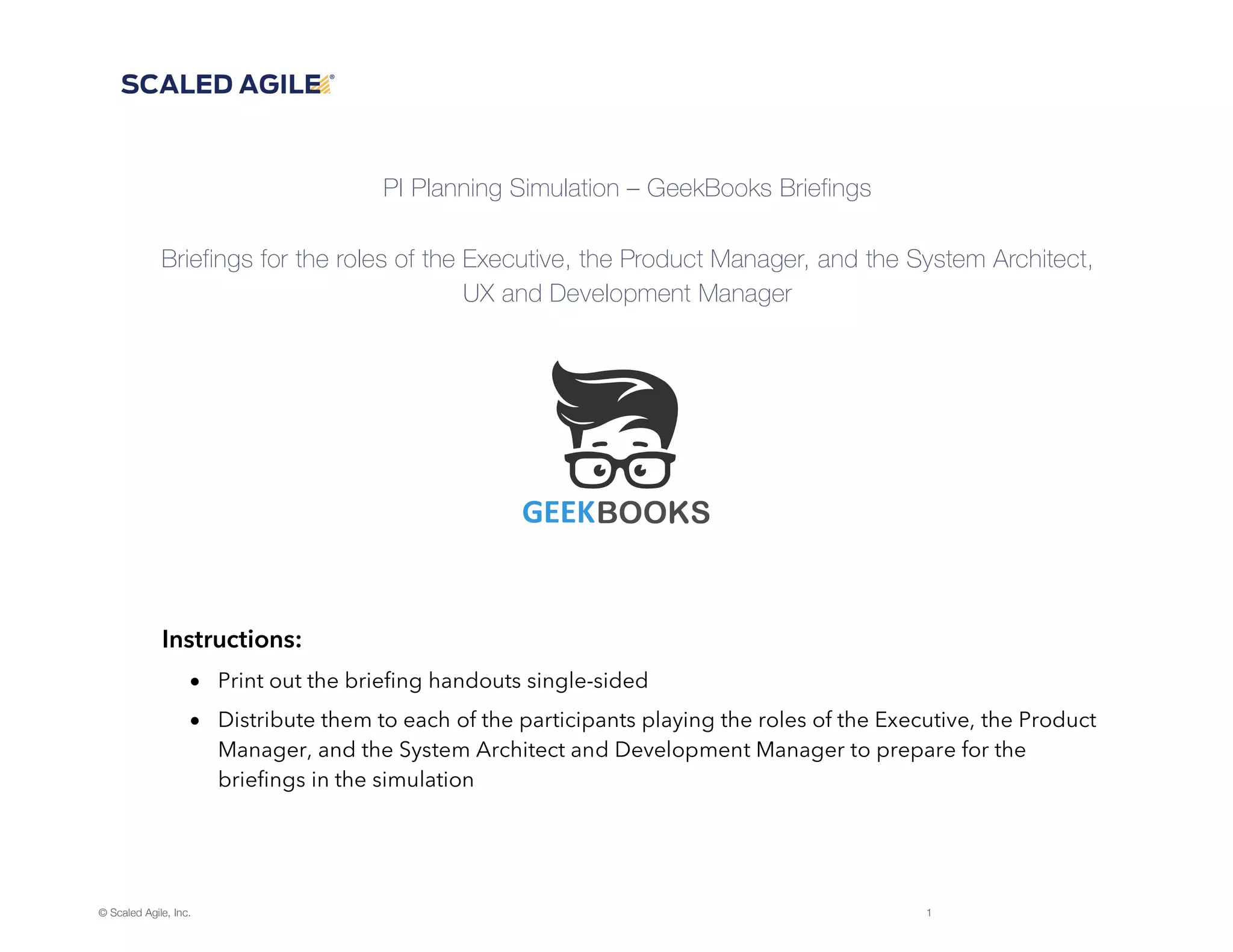 This document provides briefings for roles in a PI Planning Simulation exercise for GeekBooks, including the Executive, Product Manager, and System Architect, UX and Development Manager. Participants are instructed to print and distribute the single-sided briefing handouts to help prepare those playing the roles for their briefings in the simulation.