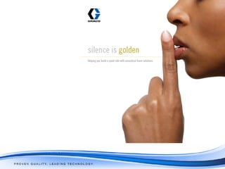The document discusses noise, vibration, and harshness (NVH) foam equipment used in automotive applications. It notes that automakers use acoustic foam to minimize noise from tires, wind, exhaust, and engines. Two common approaches are using acoustic baffles or injected foam, with injected foam providing better sealing performance. Challenges with NVH equipment include high upfront costs, potential space constraints, and high costs of ownership. The document presents the Graco HFR metering system as offering more advanced and reliable technology for NVH foam applications at a lower initial investment compared to traditional custom systems.