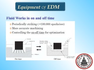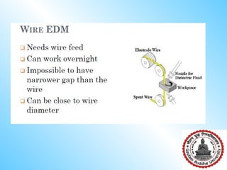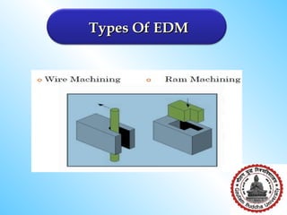 Electrical discharge machining (EDM) involves using electrical sparks to erode metal surfaces. Key aspects include: