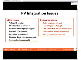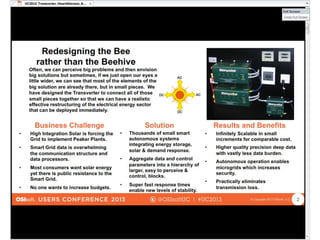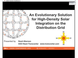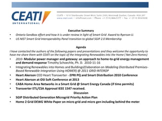 The document discusses the Ontario Sandbox effort and its evaluation in light of smart grid advancements, particularly focusing on integrating renewables into homes and buildings. It emphasizes the necessity of interoperability within the smart grid, highlighting various standards and collaborative initiatives aimed at modernizing the electrical power grid. Additionally, it details innovative technologies like the heart transverter that enable efficient energy management and the integration of renewable energy sources at the residential level.