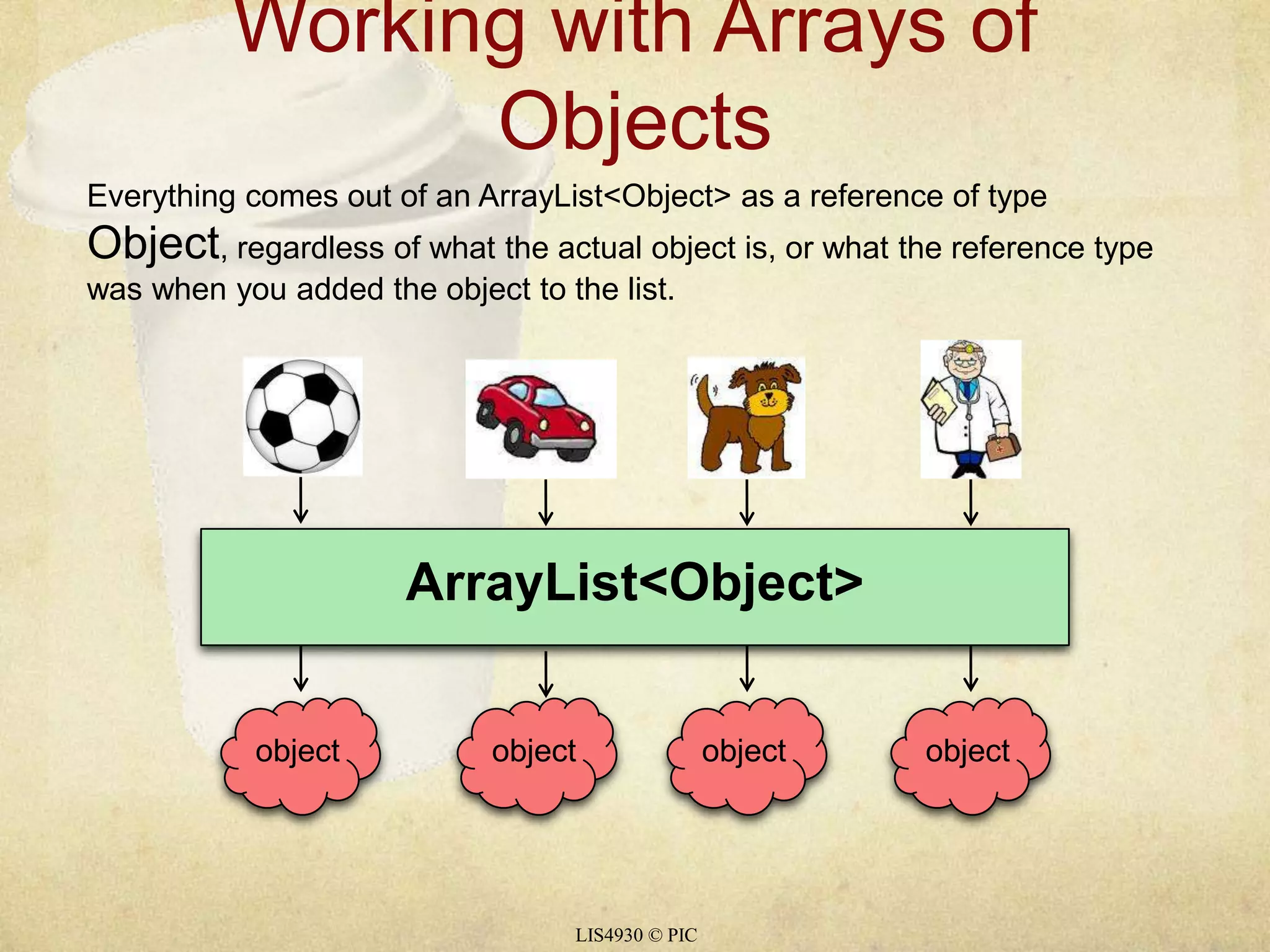 - Everything from an ArrayList<Object> comes out as an Object reference type regardless of the actual object type.