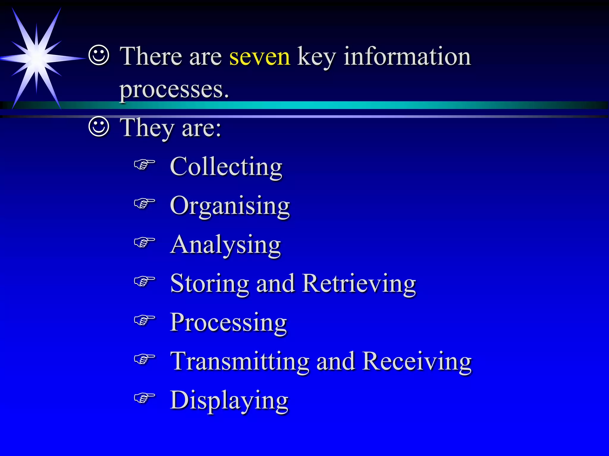 There are seven key information processes: collecting, organising, analysing, storing and retrieving, processing, transmitting and receiving, and displaying. These processes are used together to create computer-based systems that meet the needs of individuals or groups. The processes involve defining required data sources, gathering data, representing data format, interpreting data into information, saving data and information for later use, manipulating data into a suitable form, sending and receiving data and information within and beyond systems, and deciding information display forms.