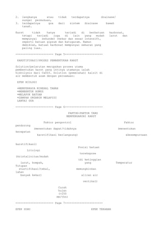 Dokumen ini membahas tentang lahan karst, termasuk definisi, ciri-ciri, proses pembentukan, dan faktor-faktor yang mempengaruhinya. Karst adalah bentang alam yang terbentuk akibat proses pelarutan batuan, terutama batuan karbonat, yang menghasilkan cekungan, gua, dan sistem drainase bawah tanah. Terdapat berbagai klasifikasi dan tahap perkembangan karst yang dipengaruhi oleh iklim dan litologi.