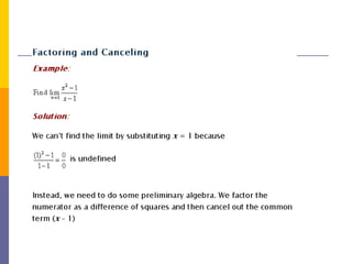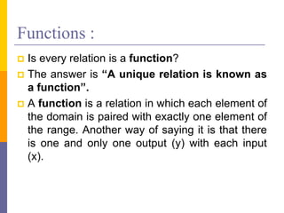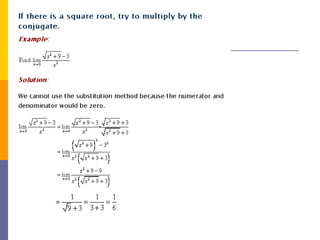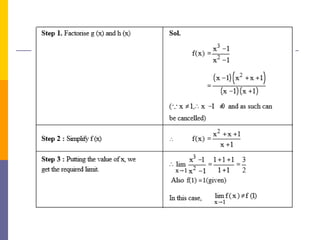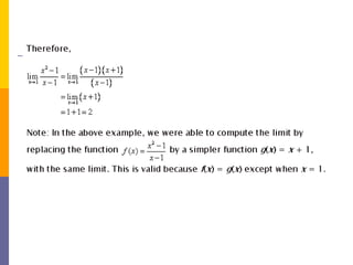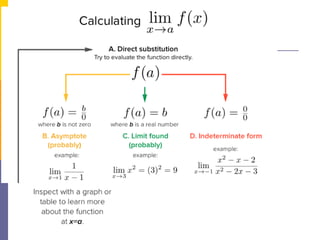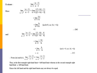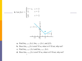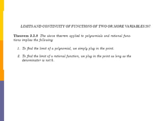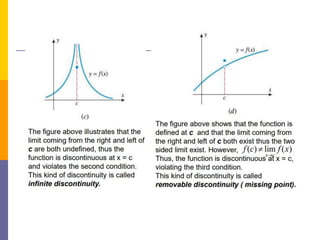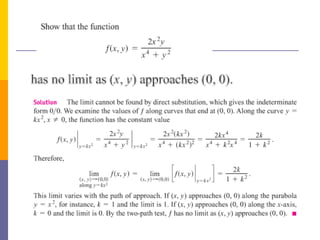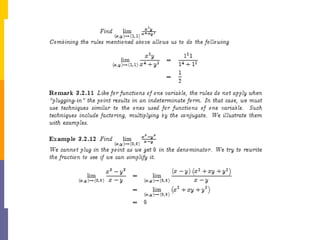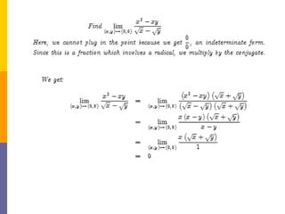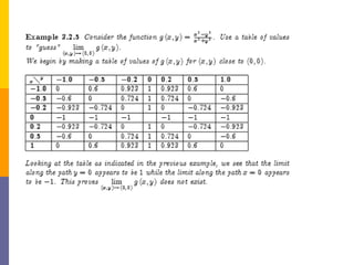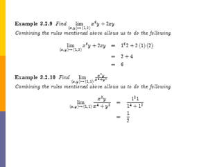 The document provides an overview of functions and limits. It defines a function as a relation where each input is paired with exactly one output. Functions can be represented graphically and include types like linear, quadratic, polynomial, and trigonometric. Limits describe the behavior of a function as inputs approach a value. For single-variable functions, limits can be evaluated at finite and infinite points. For multi-variable functions, limits may not exist if the function approaches different values along different paths to the point. Continuity requires a function's limit to exist and agree with its actual value at a point.