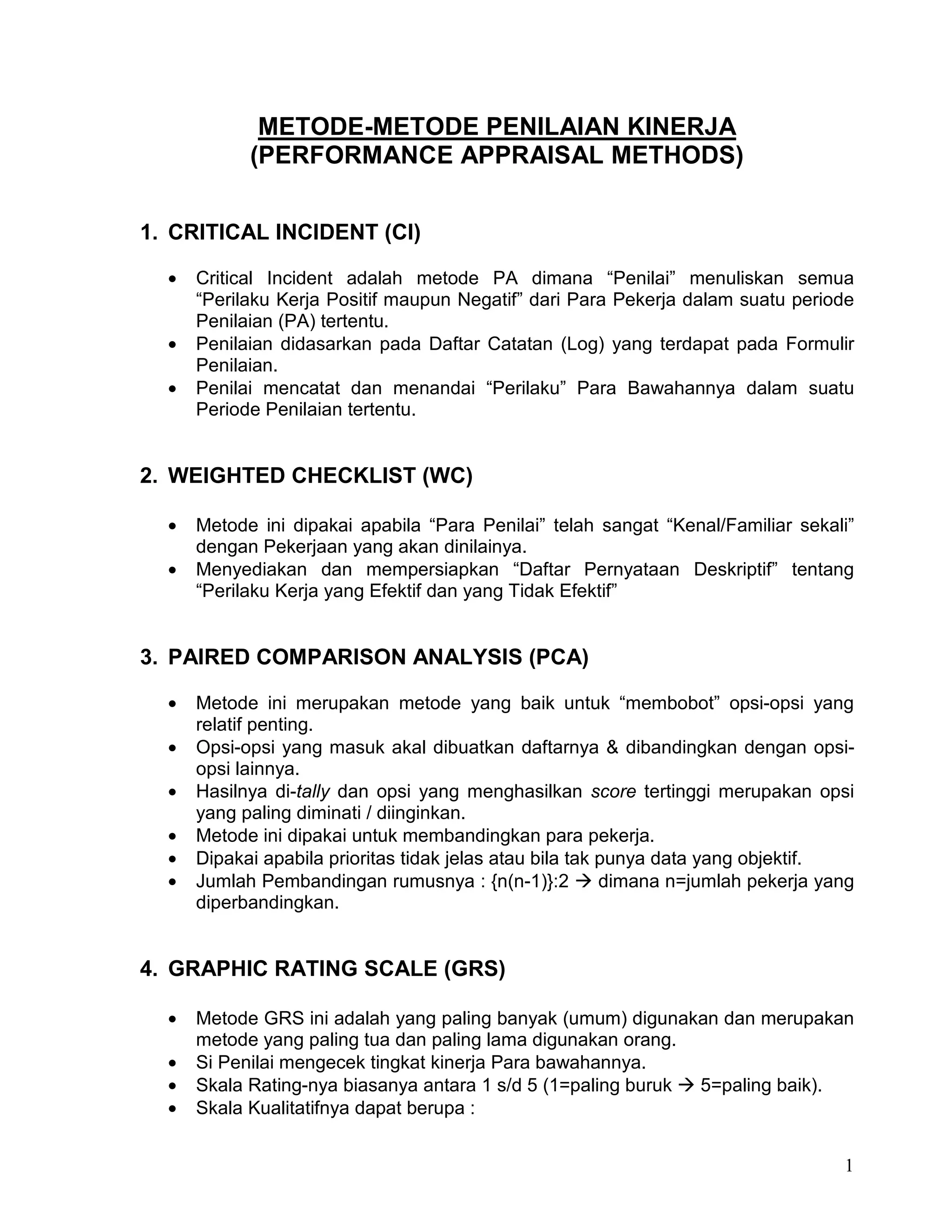 Metode-metode penilaian kinerja meliputi critical incident, weighted checklist, paired comparison analysis, graphic rating scale, essay evaluation, behaviorally anchored rating scale, performance ranking method, management by objective, 360 degree performance appraisal, forced ranking, dan behavioral observation scale. Metode-metode tersebut digunakan untuk menilai kinerja karyawan berdasarkan perilaku, kriteria kuantitatif dan kualitatif, serta pemeringkatan kinerja relatif antar karyawan.