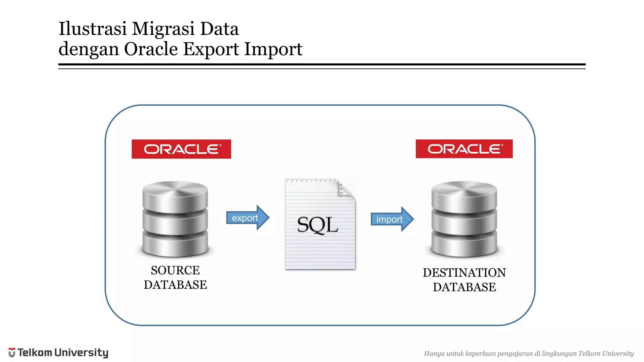 Dokumen ini membahas tentang migrasi data menggunakan Oracle Export Import. Terdapat tiga cara migrasi data yaitu mode interaktif, file parameter, dan command line. Jenis migrasi data yang dibahas adalah migrasi seluruh basis data, pengguna, dan tabel. Parameter yang dapat digunakan pada Export Import antara lain BUFFER, FILE, PARFILE, FROMUSER, TOUSER, OWNER, COMPRESS, GRANTS, TABLES, ROWS, IGNORE.