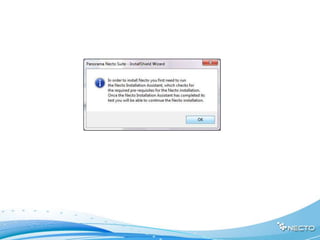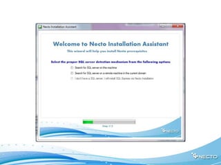 The document provides instructions for installing Necto software and migrating from NovaView. It discusses prerequisites like SQL Server and Windows 2008 components. The installation process involves running an assistant, extracting files, providing license/directory information, configuring databases and services. Post-installation includes IIS, SQL and IE security configuration. Migration starts by selecting the NovaView folder, then books and dashboards are transferred. Validation ensures the migration was successful.